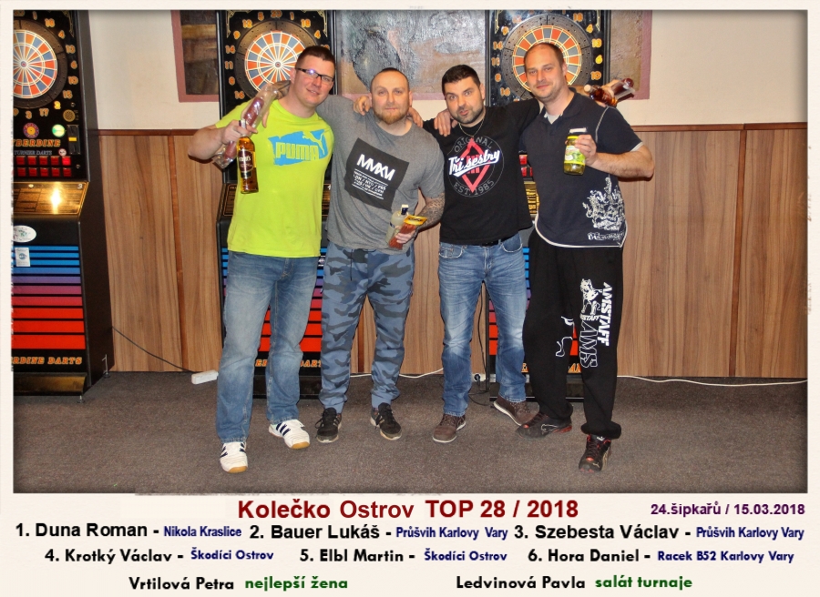 Nejlepší ženou v turnaji, se s osmým místem stala Ivana Slouková 👧, která si z Ostrova odvezla lahvinu jahodového Avanti a k tomu velkou tabulku čokolády. Na krásném 6. místě překvapivě skončil Jindra Vojtek. Kdyby nenadejchal více jak 2 promile, mohl to být i onějaký ten stupínek ještě výše 🍻 Pětku měl nejlepší Škodík František Hochmann. Letní pauza mu zřejmě nadmíru prospěla 😎 Bramboru a mega štangly paprikáše si do Nejdku odvezl Rada Kruta Rada. Ten si sebou vzal i veselou krávu za zavření 112. Pedro Coudy měl skvělé náhozy, ale překvapivě slabší doubly. Musel se tak spokojit "pouze" s trojkou a grilovacíma klobáskama. Ve finále si to rozdali z pravačky Tunkiv Štepán a z levačky Jirka Trnka. Štěpán se zřejmě dobře vyspal. Vycházela mu takřka každá šipka. Po vítězství 2:0 se tak ve 22:39 po právu mohl radovat z celkového a zaslouženého triumfu 👏 Gentelmansky se ale vzdal lákavých utopenců a vzal si lahvninku Becherovky s paštikou 😋 Poražený finalista tak zve celou obec Rotava na dnešní velikánskou žranici 😂 K tomu ještě přidal klobásky za dvě vhozená binga a to hned v prvním zápase 🤘Všem moc děkujeme za učast, skvělou atmosféru a už teď se opět moc těšíme na příští týden 🎯