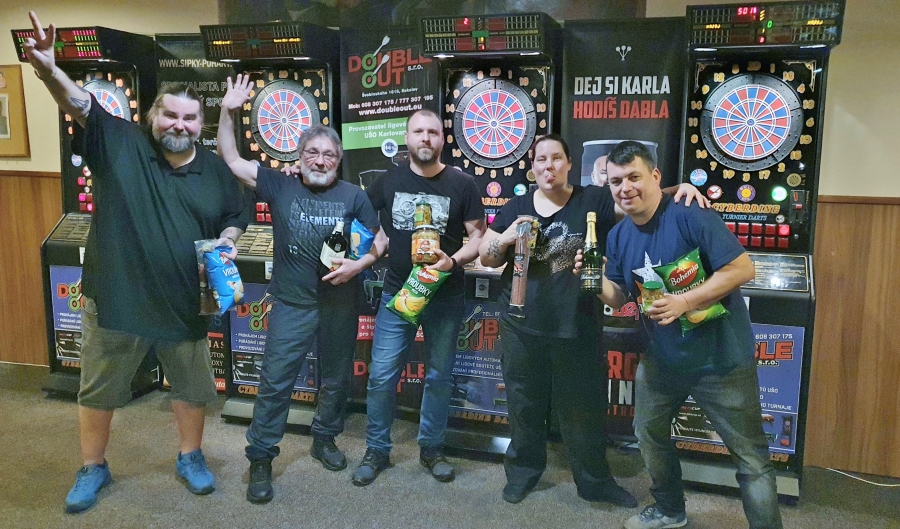 - včetně toho putovního. Nikdo ten den neodešel s prázdnou. Každý dostal nějakou tu cenu a to je vždy hlavní motto tohoto vyhlášeného turnaje! Děkujeme moc městu Ostrov za finanční podporu, bez které by se nemohli zařidit takovéto vyjímečné ceny jako tomu bylo letos. Tento ročník se před Kolečko dovezl i gril. Každý hráč tak zdarma dostal lahodnou klobásku a nebo si mohl přivézt pochutiny své Na Májové šipce jsou pokaždé závěrečné hry náročnější a celkový vítěz tak musí opravdu projevit své herní kvality. Tentokrát to však bylo mnohem více fyzicky i alkoholově náročnější I přesto však poslední čtyři hráči hráli na tři vítězné legy. Účastické ceny vyhráli : Zdeněk Štěpánek 1 x pivo zdarma, Míra Podzimek 2 x pivo zdarma, Vlasta Čegan 3 x pivo zdarma, Eliška Krohová 4 x pivo zdarma a hlavní cenu 5 x pivo zdarma vyhrál Míša Peterka. Ten si cenu náramně a dokonale vychutnal 😃 Na posledním místě a tím i okurkou turnaje se stala Míša Podzimková. Nejlepší ženou se v samostatném turnaji překvapivě stala Mirka Esková ( Škodíci Ostrov ), která ve finále a v pozdějším superfinále porazila hlavní adeptku Petru Peterkovou hrající za LVI Karovy Vary. Třetí místo brala amatérka Míša Podzimková z Ostrova. V hlavním turnaji na celkovém a společném 7.-8. místě skončili bombarďáci